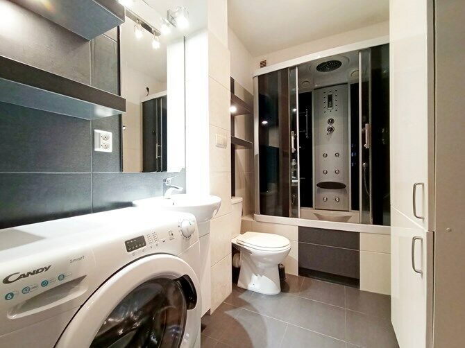 Łazienka: pralka, kabino wanna, WC, umywalka.