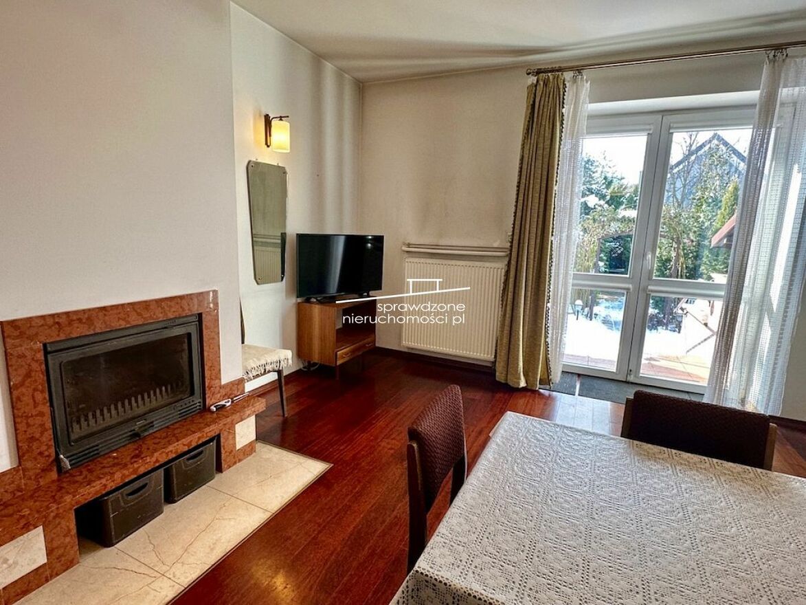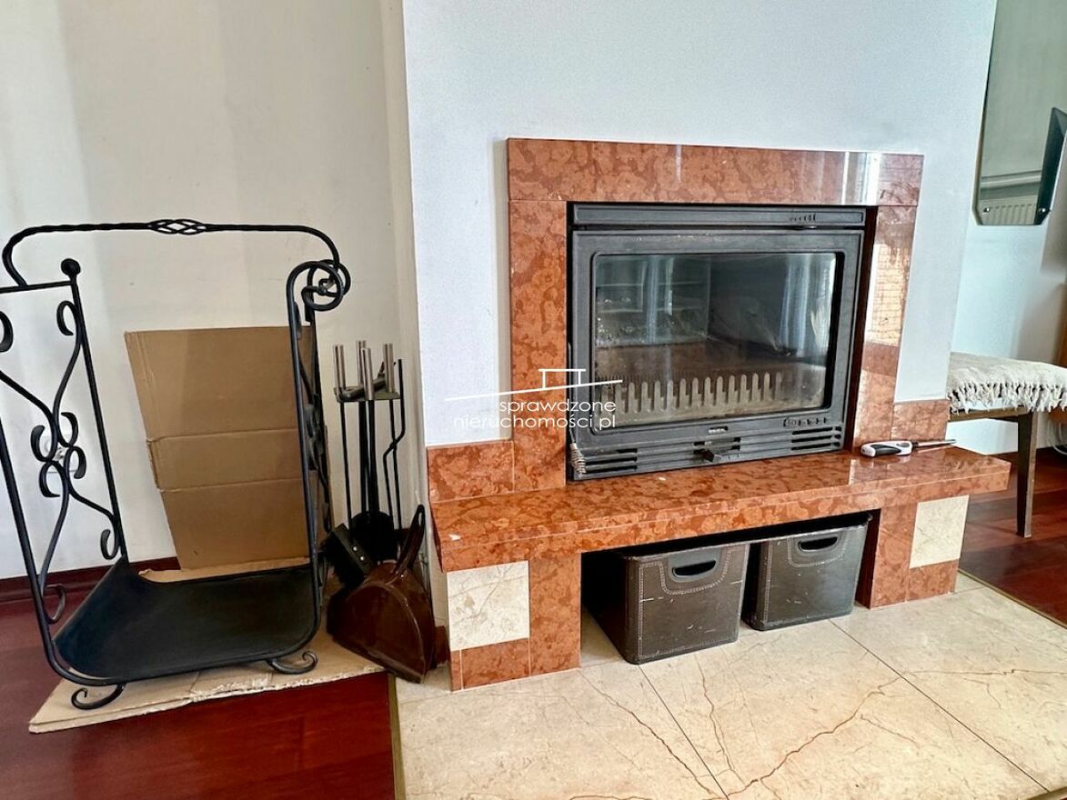 - Duży pokój z KOMINKIEM - wyposażony w meble (przeszklona biblioteka, szafa na ubrania, łóżko, stół z 4 krzesłami oraz mniejszym stolikiem - miejscem do pracy.
