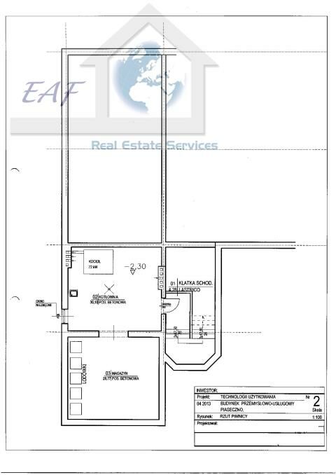 Budynek produkcyjno - biurowy, murowany dwukondygnacyjny, częściowo podpiwniczony. Ściany zew. grub. 45cm, strop "TERIVA" i "płyta żerańska". Okna PCV i stalowe.