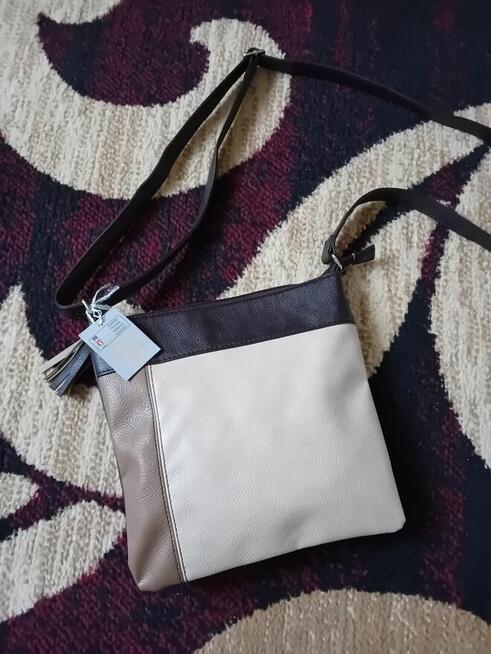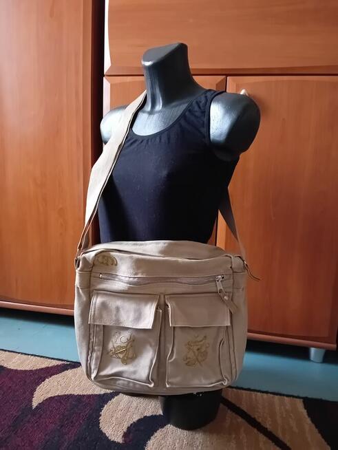Torba na ramię w kolorze beżowym, używana. Idealna do codziennego użytku, pomieści wszystkie niezbędne rzeczy. Wygodna ...