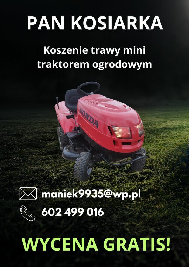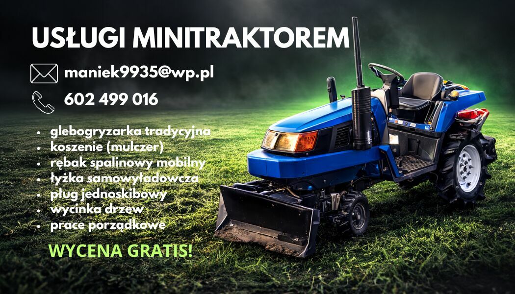 Oferuję usługi mini traktorem ogrodowym w skład których wchodzą:- glebogryzarka tradycyjna (przekopywanie ziemi pod trawniki,rabaty,nasadzenia}