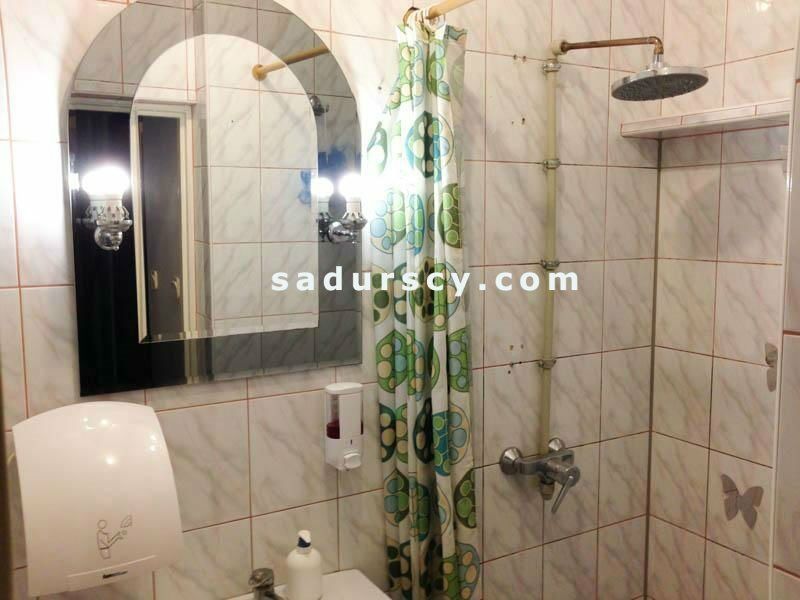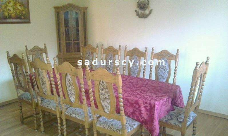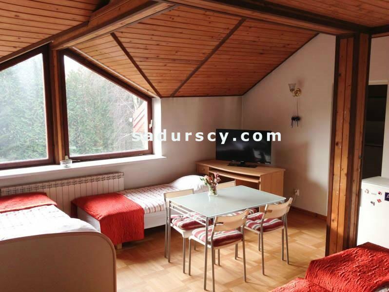 Na parterze salon 45m 2 z kominkiem, wyjściem na taras 75m 2 od południowego zachodu. Okna w salonie od południowego zachodu, południowego wschodu, północnego zachodu. Jadalnia z oknami od północnego zachodu, kuchnia z oknem od północnego wschodu. W kuchni zabudowa i sprzęt AGD: płyta ceramiczna, piekarnik elektryczny, okap, zlewozmywak, lodówka. Z holu dostępne toaleta z WC, umywalką i prysznic. W parterowym skrzydle budynku sześć sypialni, po ok. 12m 2 każda, oraz łazienka z wanną owalną. Na półpiętrze dwa pokoje: 40m 2 i 15m 2 z tarasem 12m 2 . Na piętrze dwie sypialnie: 40m 2 i 35m 2 . Skosy. Na podłodze klepka dębowa. Toaleta z WC umywalką, łazienka z kabiną prysznicową.